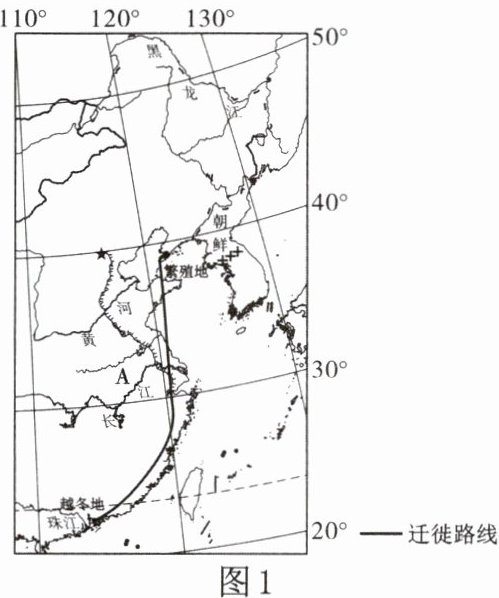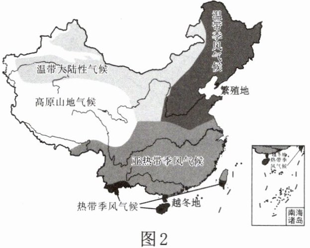 材料二 黑脸琵鹭迁徙路线图(图1)和我国主要气候类型分布图(图2)。