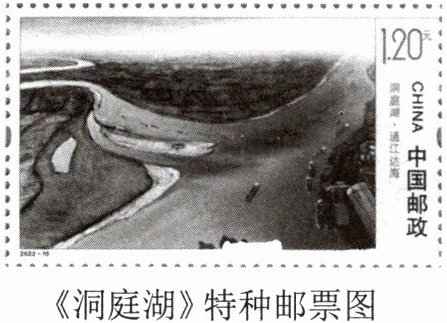 2022年中国邮政发行了一套《洞庭湖》特种邮票。邮票图案名称分别为君山叠翠、凌云鹤影、城头稻源、通江达海。如图为“通江达海”,描绘了洞庭湖水入长江处三江口水面宽阔、百舸争流的壮丽景象。