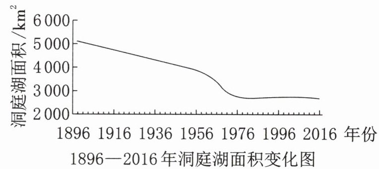 1896—2016年间洞庭湖面积大幅缩小(如图)。洞庭湖区的环境问题主要有泥沙淤积,湖面缩小;多次人工围垦,洪涝灾害频繁;工业、农业和生活污染比较严重,生物多样性减少。这些环境问题严重制约着洞庭湖区的可持续发展。