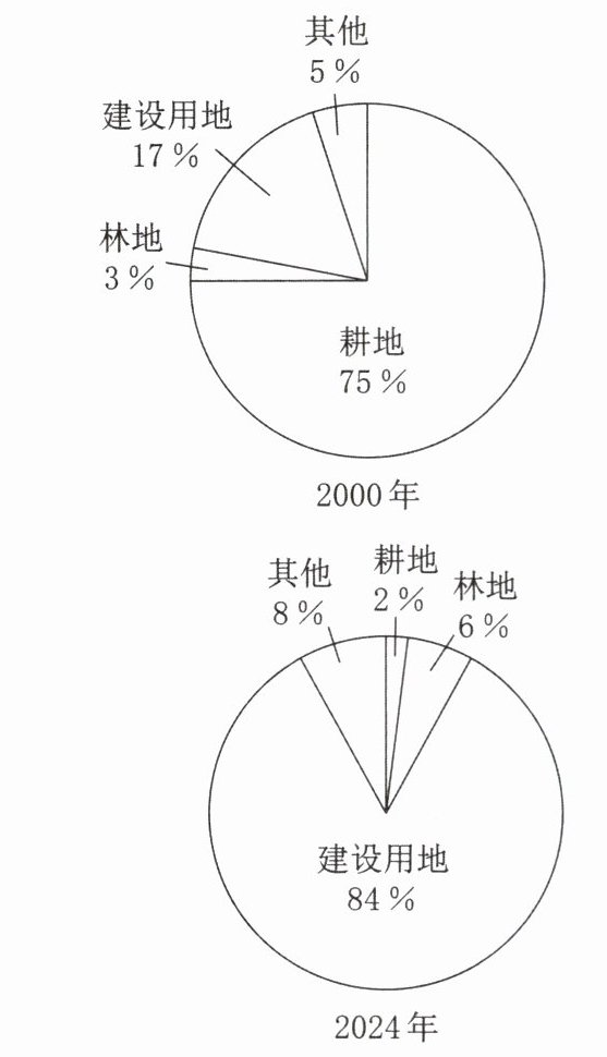 5. C 解析:从2000年到2024年,林地由3%变为6%,林地面积在扩大,A错误。图中未显示草地所占比例,无法说明大量草地成为建设用地,B错误。耕地由原来的75%变为2%,建设用地由原来的17%变为84%,说明大量耕地变为建设用地,C正确。建设用地面积变大,所以不存在大量建设用地变成林地,D错误。故选C。