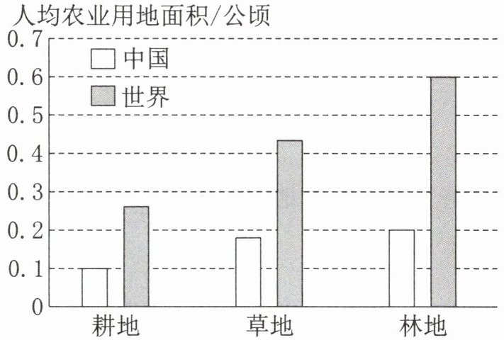 作为人口大国,我国的人均农业用地面积与全球平均水平存在显著差距。如图为我国人均农业用地面积与世界的比较图。读图,完成 1~2 题。