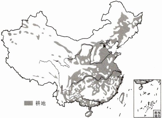 耕地红线是国家为确保农业生产所需土地而划定的最低保障线。目前全国划定的耕地红线是 18 亿亩。这个红线坚决不能逾越。如图示意我国耕地集中分布区。读图,完成 7~8 题。