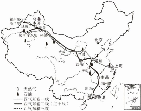(教材改编题·P84活动)西气东输管道系统是我国建设的大型资源跨区域调配工程之一。读我国西气东输管道运输主干线示意图,回答6~7题。
