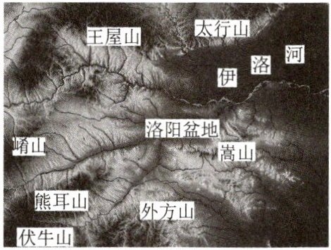 河南省洛阳市自然条件优越,地质条件稳定,特色物产众多。如图为洛阳盆地简图。据此完成6~7题。