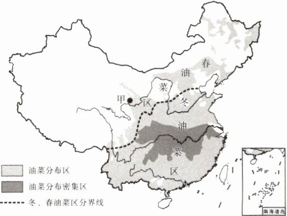 油菜花已成为神州大地上一道亮丽的风景线。油菜花盛开时节,摄影爱好者会踏上追寻油菜花的金色之旅。读我国冬、春油菜主要分布区示意图,完成4~6题。