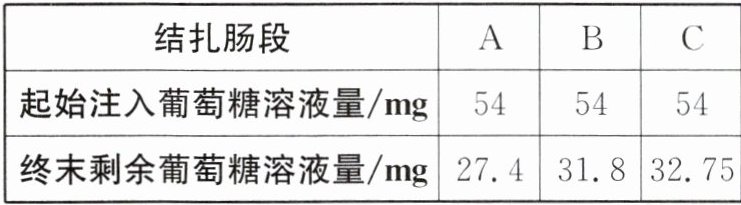 (3)为验证上述假设,同学们分别从三个部位各选取30cm的肠段A、B、C,并在两端进行结扎处理,随后向不同肠段内注入54mg的葡萄糖溶液,30min后测定肠段内剩余葡萄糖溶液量。本实验共重复了6次,计算测定数据的平均值,获得结果如下表。