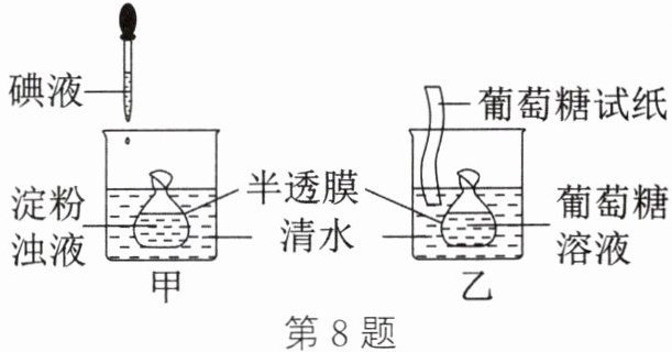 8. (核心素养)模拟实验能够让抽象复杂的事物变得直观易理解。小明尝试通过模拟实验来学习小肠的功能,如图,在半透膜内分别加入淀粉浊液和葡萄糖溶液,并放入装有清水的甲、乙烧杯中,静置一段时间后分别加入碘液和葡萄糖试纸(已知该试纸为蓝色,与葡萄糖溶液接触后变黄色)。