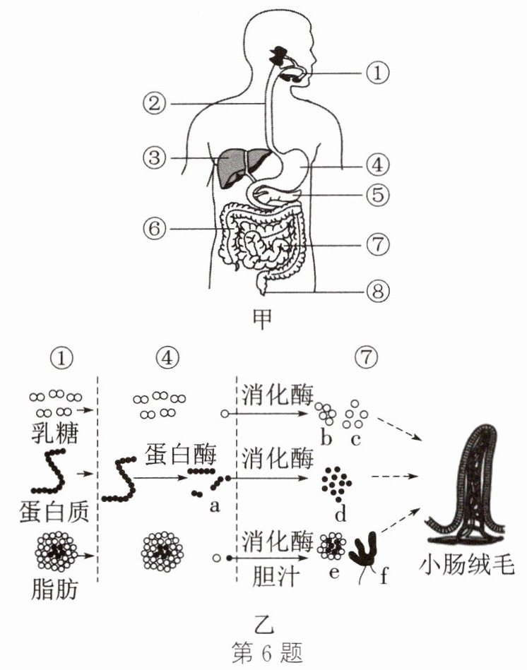 6. (2025·石家庄期中)牛奶主要成分有水、脂肪、蛋白质、乳糖、无机盐等,喝牛奶已经成为现代人生活的一部分。如图甲是消化系统结构示意图,图乙表示牛奶在不同消化器官中的变化过程。请据图分析回答: