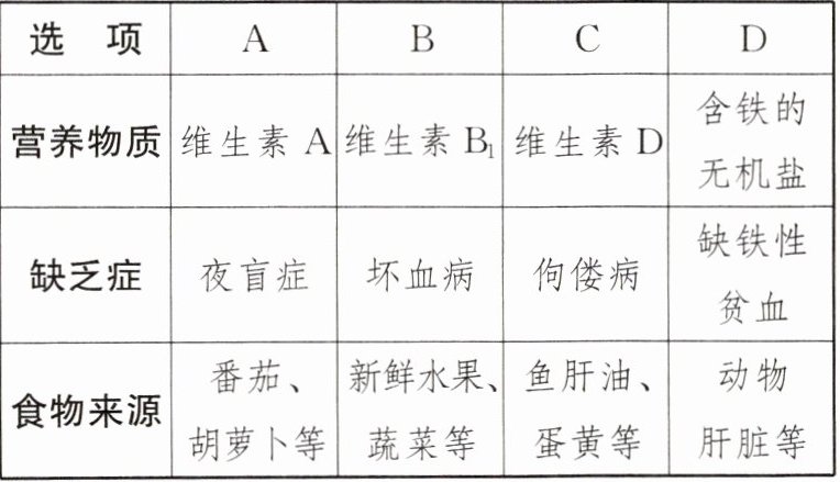4. 2025年第36届“5·20”中国学生营养日的主题为“吃动平衡 身心健康”。人体健康需要合理的营养供应。表中对应关系错误的是(
