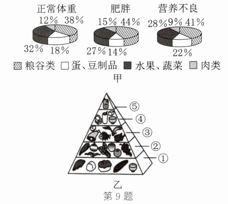 9. (生产生活)如图甲、乙分别是不同人群每天摄入的食物比例和“平衡膳食宝塔”,请仔细观察后回答下列问题: