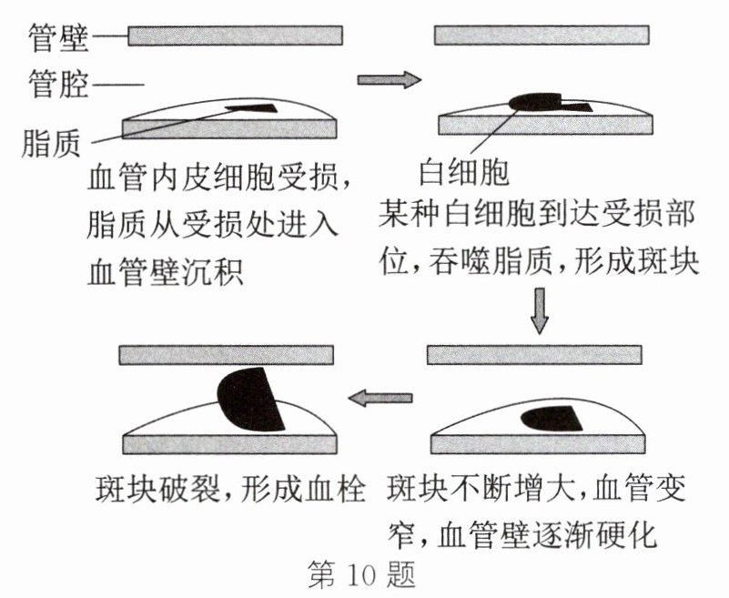 10 C 解析:动脉血管管壁厚,弹性最大,管腔较小,血流速度最快,其功能为将血液从心脏输送到全身各处,A正确。白细胞能吞噬病菌,具有防御和保护作用,是人体健康的“卫士”,B正确。在动脉管壁内皮损伤,脂质沉积的基础上,白细胞到达受损处吞噬脂质形成斑块,导致血管变窄、弹性变小,C错误。坚持锻炼可减少心血管疾病的发生,D正确。