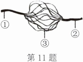 11. (核心素养)研究小组利用废旧电线设计制作了三种血管关系的模型,如图所示。在模型中,①是红色电线,②是蓝色电线,③是细铜丝。请据图回答下列问题。
