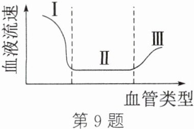 9. (2024·沛县段考)如图是人体某处血液流速变化示意图,图中Ⅰ、Ⅱ、Ⅲ分别代表人体内三种不同类型的血管。据图分析,下列说法正确的是(