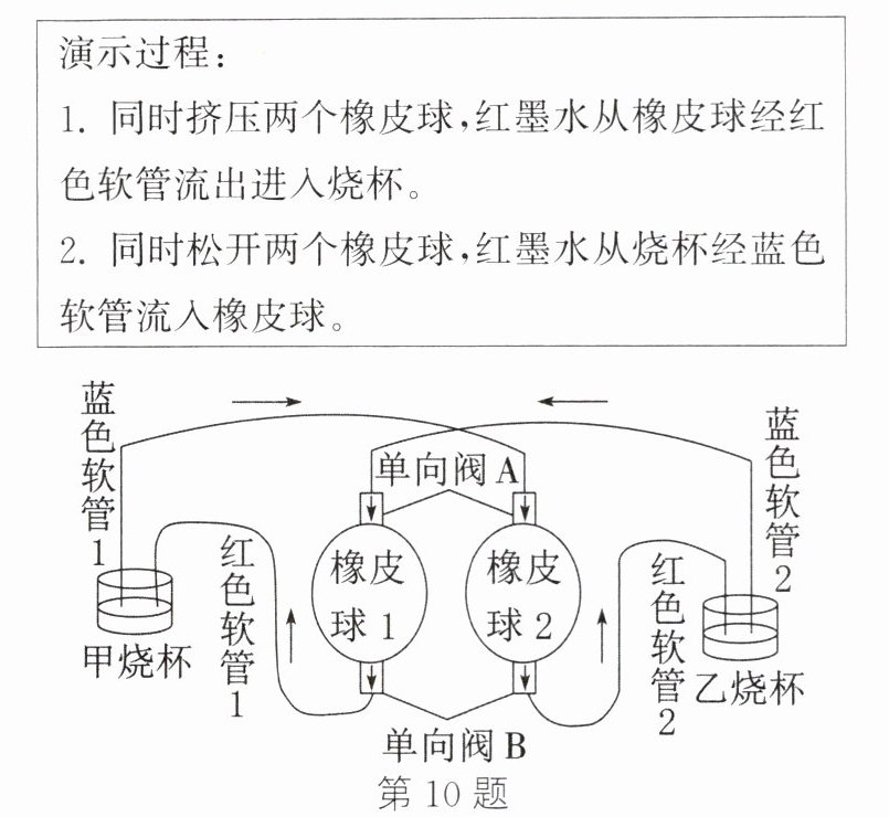 10. (核心素养)如图为某同学在校园科技节上的参赛作品——血液循环演示模型,其中单向阀模拟瓣膜(箭头表示液体流动方向),软管模拟与心脏相连的血管,装置内的红墨水模拟血液。据图回答: