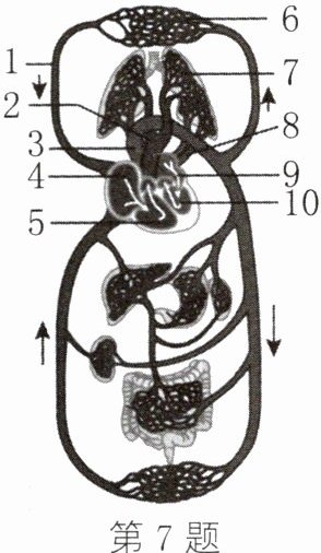 7 (1)左心室 分离 4 (2)7 动脉 解析:图中的1是上腔静脉、2是肺动脉、3是主动脉、4是右心房、5是右心室、6是身体上部的毛细血管、7是肺部毛细血管、8是肺静脉、9是左心房、10是左心室。