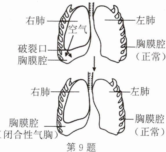 9. (2025·昆明模拟)某患者肋骨骨折端刺破肺泡,致使右肺表面出现破裂口,气体由破裂口进入胸膜腔,后因破裂口闭合,气体积于胸膜腔内无法进出形成闭合性气胸(如图)。下列分析正确的是(