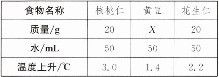 3. (2025·晋中模拟)探究某种食物中含有能量的多少,可以用食物燃烧放出的能量使水温升高的方法来测定。某生物学兴趣小组对不同食物中的能量进行测定,实验结果如下表所示。下列分析错误的是 (