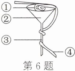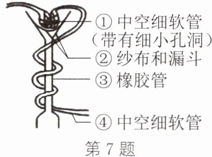 7.A 解析:图中的①中空细软管(带有细小孔洞)模拟的是肾小球(毛细血管球)。图中的②纱布和漏斗模拟的是肾小囊。图中的③橡胶管模拟的是肾小管。图中的④中空细软管模拟的是缠绕在肾小管外的毛细血管。