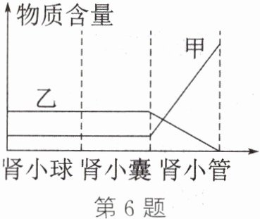 6. (2024·眉山)如图中甲、乙两条曲线表示肾单位形成尿液的过程中,肾小球中的血浆、肾小囊中的原尿、肾小管中的尿液中两种物质含量的变化情况,曲线乙代表的物质是(