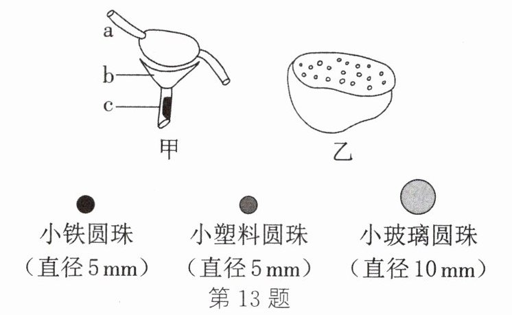 13. (核心素养)某同学用橡皮管、球、漏斗、小磁条做了一个肾单位的模型,模型结构如图甲,其中小磁条贴在漏斗下端的内部,且不影响所有类型的小圆珠通过。图乙表示球的内部,在球的水平面有一个塑料隔板,隔板上有很多直径为6mm的圆形小孔。同时准备了三种小圆珠若干,三种小圆珠从a小管处灌入实验装置。请分析并回答问题: