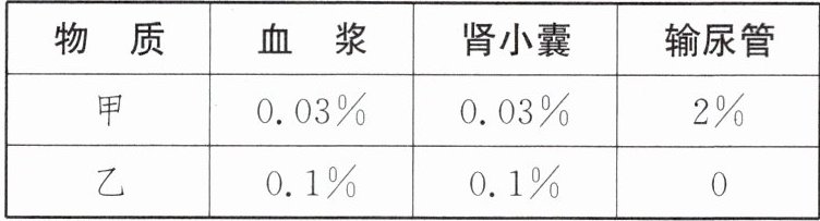9. (2024·鼓楼段考)下表是被测者的血浆、肾小囊、输尿管中甲和乙两种物质的浓度,请据表分析甲和乙分别是(