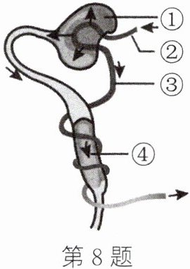 8.B 解析:②入球小动脉和③出球小动脉里流的都是动脉血,与②中血液相比,③中氧气含量没有明显变化,B错误。