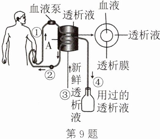 9.(生产生活)若肾脏发生严重病变,则需要通过人工肾净化血液。将病人的血液引入透析器,利用透析膜将血液中的废物过滤后排出,再将净化后的血液送回病人的静脉中,透析过程如图所示,①②③④表示结构。下列分析不正确的是(