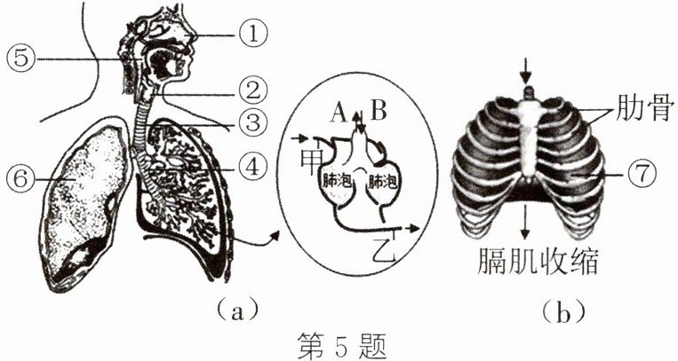 5. 图(a)表示人体呼吸系统的组成,图(b)表示人体进行呼吸时呼吸肌的状态。①~⑥表示器官,A、B表示呼气和吸气过程,甲、乙表示血管。请据图回答下列问题: