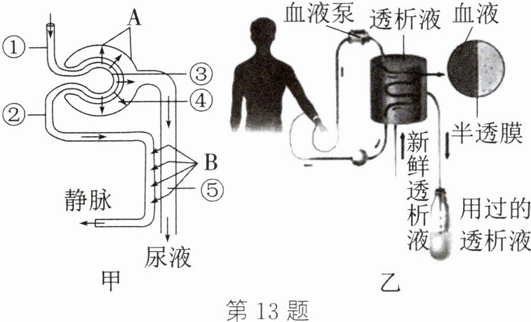 13.(2024·沛县段考)肾脏是人体的“净化器”,对于健康十分重要。有关数据显示,肾脏在一个小时内可以将全身血液滤过12~15遍。图甲是人体肾单位模式图,图乙是血液透析示意图,请回答下列问题。