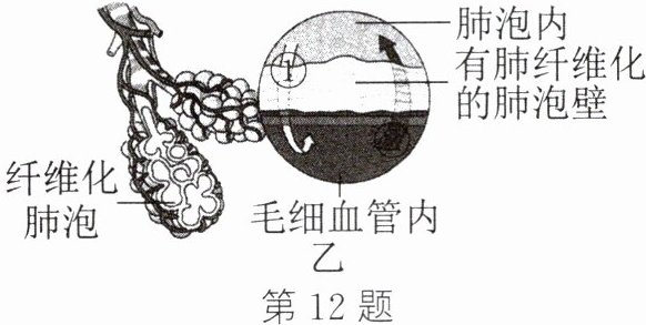 12.D 解析:肺泡与血液的气体交换:氧气扩散进入血液,二氧化碳扩散进入肺泡,所以①是氧气、②是二氧化碳,A 错误。血液流经肺部毛细血管时,发生气体交换,血液中氧气增多,二氧化碳减少,所以血管 b 内流动的血液为动脉血,B 错误。肺泡与血液的气体交换是通过气体的扩散作用实现的。肺纤维化会导致肺泡的壁变厚,从而影响气体的扩散,C 错误、D 正确。