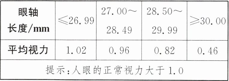 7. (新情境)医学人员为了探究眼轴(眼球前后径)长度和视力的关系,检查了 180 位不同近视程度的志愿者的眼轴长度和视力,记录如下表。相关叙述正确的是(