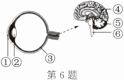 6. 我们的学习和生活离不开感觉器官和脑的活动。请依据眼球及脑的结构示意图回答问题: