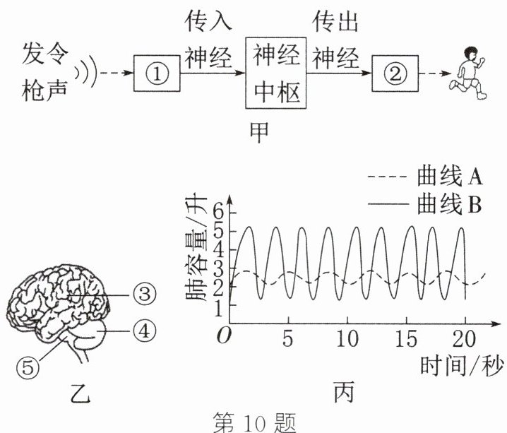 10. (新情境)2024年6月2日,“心无界 步边疆”吉林边境森林马拉松系列赛首站比赛在吉林省珲春市举行。随着一声发令枪响,选手们从起点鱼贯而出,奔跑在山水之间。图甲为从枪声响起到起跑的过程示意图,图乙为脑的组成示意图,图丙为人在两种不同状态下的呼吸情况曲线图。据图回答问题: