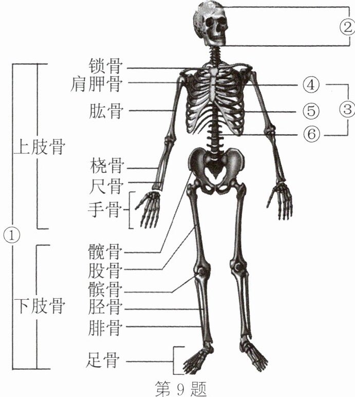 9. 观察人体的骨骼组成模式图,据图回答问题。