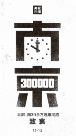 7. 示例:这幅海报的主体是“南京”二字,黑色粗体,给人庄严肃穆之感。南京的“南”字内部变形为一个钟表,时间停留在10:00。10:00是警报拉响的时间,寓意要铭记历史,警钟长鸣。“京”字中间是白色数字“300000”,寓意30万南京大屠杀遇难同胞。海报最下方是“此刻,向30余万遇难同胞致哀”字样和日期“12-13”,显示了海报的主题和公祭日时间。