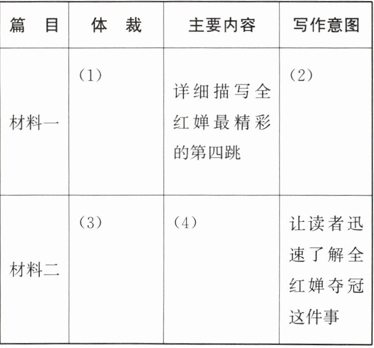 4. 两则材料虽然都属于新闻,但在新闻体裁和写作意图上有所不同,请结合两则材料的内容简要分析,完成下表。