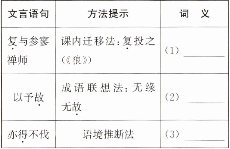 1. 参考表格提示的方法,解释下面句中的加点词。