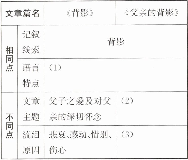 10. (链接课文) 本文与朱自清的《背影》均抓住“父亲的背影”来展开叙事抒情,但在文章主题等方面有所不同。请联系朱自清的《背影》,品读两篇文章,填写表格。(3 分)
