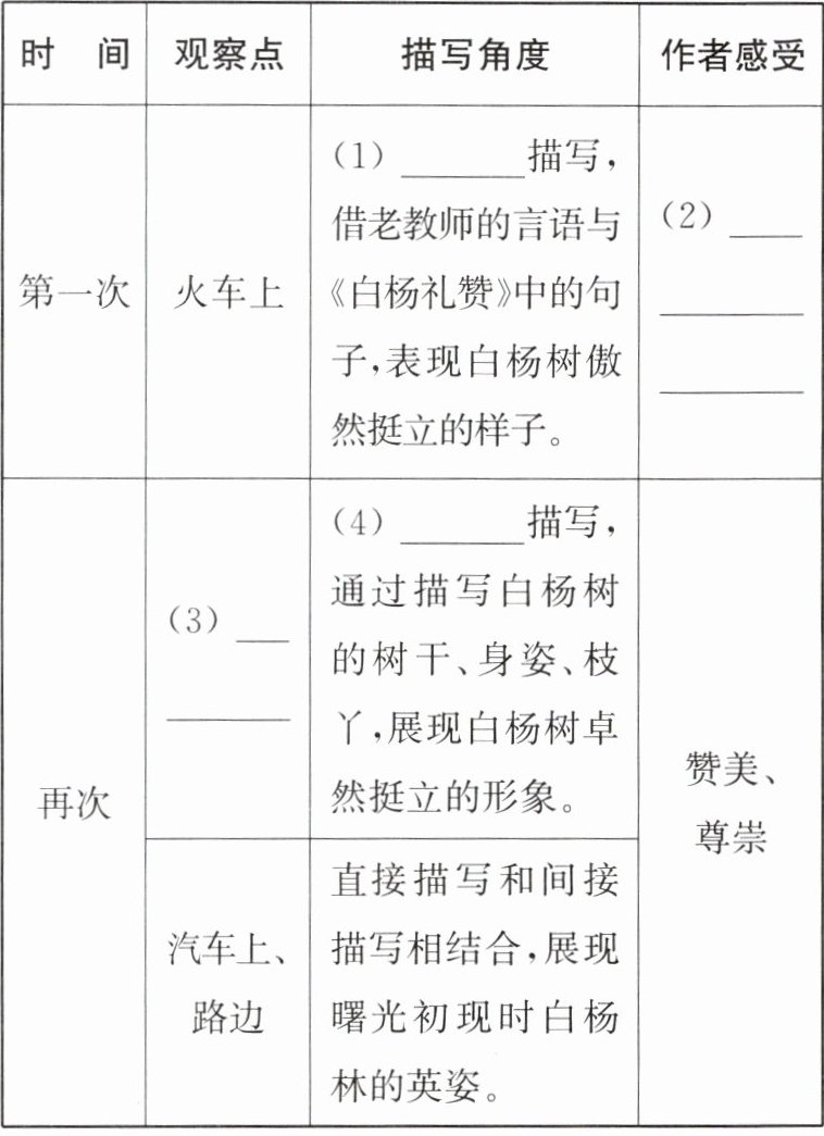 8.(1)间接 (2)激动、震撼 (3)近距离(或:白杨树下、白杨林中) (4)直接(每空1分) 9.运用了拟人、比喻的修辞手法,展现了白杨树英姿飒爽、坚强不屈、挺拔伟岸的特点,表达了作者对白杨树的赞美。(4分) 10.示例:抓住“没有”这个词来表现“抑”的一面,朗读节奏慢,语气轻。而读“但是”“更”时要体现由抑转扬的语气,“伟丈夫”要重读,既要读出句式的强烈语气,引起人们的深思,又要读出文章的激情与豪气。(4分) 11.①作为情感线索,贯串全文;②引发联想,将眼前之景与茅盾先生《白杨礼赞》一文融合在一起,表达了作者的真切体悟;③进一步表达了作者对白杨的形象和精神的赞美之情(每点1分) 12.示例:白杨树身躯挺拔、树枝靠拢、外表朴质、个性坚强,是西北高原的代表性物种,是时代精神和民族性格的象征。茅盾先生敏锐地发现了这一审美特征,进而写下《白杨礼赞》这篇托物言志的散文。这首赞歌在抗日战争年代给全国人民传达了一种积极、乐观、明朗的信号,使之获得极大鼓舞。三者紧密联系,正如本文作者所说:一种树成就了一篇文章,一篇文章又反映了一个时代。(4分)