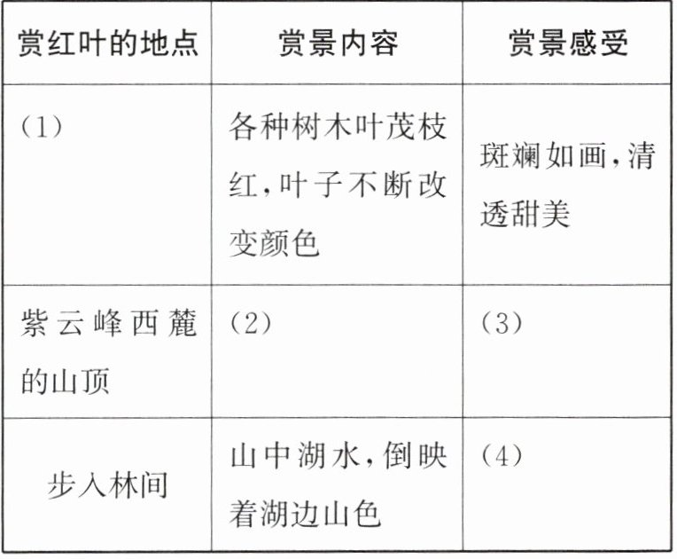3. 本文写了“我”于紫云峰赏红叶及内心的感受。阅读全文,根据提示填写下表。(4 分)