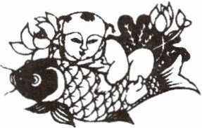 8. 示例:画面内容是一个胖小孩怀抱一条肥大的鱼,小孩身后两侧是荷叶、荷花。寓意是连年有余(或:年年有余、喜庆有余)。