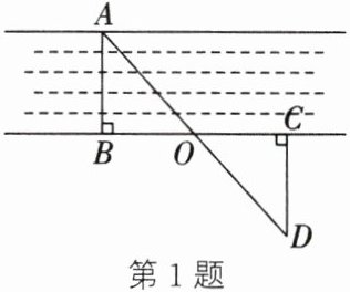 1. 小明利用全等三角形的知识测量河的宽度 $ AB $,设计了如图所示的方案. 在河边选了一点 $ O $,然后在 $ BO $ 的延长线上找一点 $ C $,使 $ OC = OB $,在点 $ C $ 沿与河边垂直的方向直走到点 $ D $,观察到 $ A $,$ O $,$ D $ 三点在同一条直线上. 测得 $ CD $ 的长,就是河的宽度 $ AB $,小明这种设计方案的原理是(