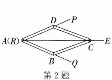 2. 如图,小敏做了一个角平分仪 $ ABCD $,其中 $ AB = AD $,$ BC = DC $,将仪器上的点 $ A $ 与 $ \angle PRQ $ 的顶点 $ R $ 重合,调整 $ AB $ 和 $ AD $,使它们分别落在角的两边上,过点 $ A $,$ C $ 画一条射线 $ AE $,$ AE $ 就是 $ \angle PRQ $ 的平分线. 此角平分仪的画图原理是根据仪器结构,可得 $ \triangle ABC \cong \triangle ADC $,这样就有 $ \angle QAE = \angle PAE $,则说明这两个三角形全等的依据是(