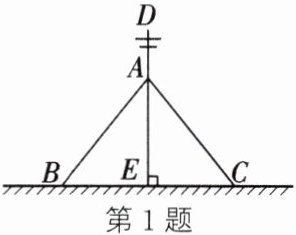 1. 如图,为了让安装 5G 设备的电线杆垂直于地面,工程人员从电线杆 DE 上一点 A 往地面拉两条长度相等的固定绳 AB 与 AC,当 BE = CE,且点 B,E,C 在同一条直线上时,电线杆 DE⊥BC.这种操作方法的依据是(