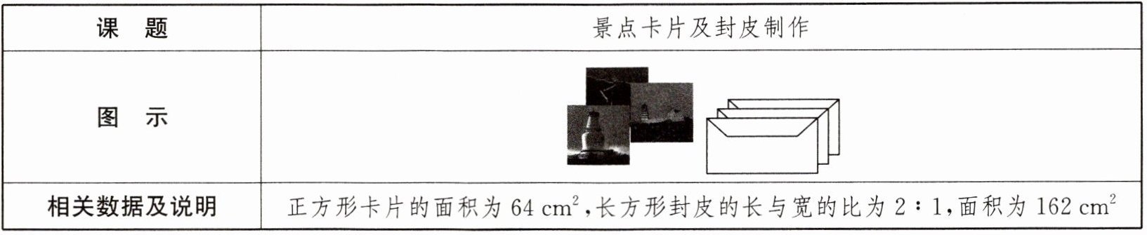 12. (新视角·项目式学习)为宣传某地旅游资源,一中学课外活动小组制作了精美的景点卡片,并为每一张卡片制作了一个特色封皮。A小组成员制作正方形卡片,B小组成员制作长方形封皮。请你通过计算,判断正方形卡片能否直接全部装进长方形封皮中。