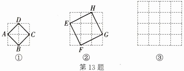 13. (新视角·操作实践题)【阅读理解】在数学学习中,我们常常借助由边长为1的小正方形组成的网格来解决问题,并把由格点(小正方形的顶点)组成的正方形称为格点正方形。图①是由4个边长为1的小正方形组成的网格,容易发现格点正方形$ABCD$的面积为2,则这个格点正方形的边长为$\sqrt{2}$。
