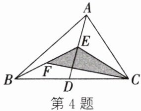 4. 如图,在△ABC中,D为BC边上的一点,E,F分别为AD,BE的中点,且$S_{△ABC}=16cm²,$则图中涂色部分的面积是