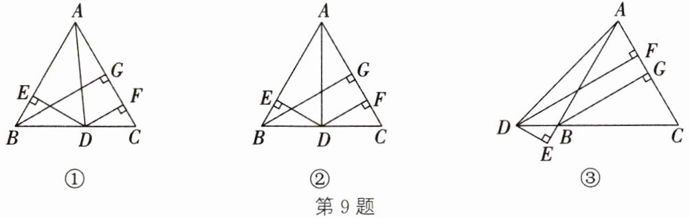 9. (数形结合思想)在△ABC中,AB=AC,D为直线BC上任意一点,连接AD,DE⊥AB于点E,DF⊥AC于点F,BG为AC边上的高.