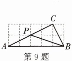 9. 如图,在网格中,每个小正方形的边长均为$1$,点$A$,$B$,$C$,$P$都在格点(网格线的交点)上,且点$P$在$\triangle ABC$的边$AC$上,则$\angle PAB+\angle PBA$的度数是