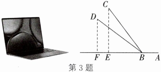 3. 如图,一台电脑平放在桌上,屏幕宽$BC$为$25\ cm$,当电脑张角为$\angle ABC$时,顶部边缘$C$处离桌面的距离$CE$为$20\ cm$,调整电脑的张角,当张角为$\angle ABD$(点$C$与点$D$为电脑顶部边缘同一点)时,顶部边缘$D$处到桌面的距离$DF$为$15\ cm$,则$E$处与$F$处之间的距离$EF$为